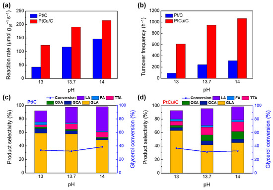 Figure 7a,b presents the calculated reaction rate and turnover frequency (TOF) for electrocatalytic glycerol oxidation over the prepared catalysts. The reaction rate and TOF values were calculated at a glycerol conversion of less than 10.0%. Compared to Pt/C, the reaction rate and TOF for PtCu/C were conditions. Specifically, the reaction rate and TOF of the PtCu/C catalyst at pH 13 were 2.93 and 6.65 times higher than those of Pt/C, respectively. This result demonstrates that the reaction kinetics of PtCu/C is better than that of Pt/C with an increasing pH, which verifies that the Cu species enhances the reaction activity for the EGOR at high pH conditions. To compare a more detailed reaction chemistry with the prepared catalysts, the product selectivity of Pt/C and PtCu/C was examined at a similar conversion level of about 20.0%, as shown in Figure 7c,d. The reaction time in the electrochemical batch reactor was adjusted to about a 20.0% conversion level. At acidic (pH 0.3) and neutral (pH 6) conditions, the Pt/C and PtCu/C catalysts exhibited similar product distributions, producing GAD and GLA chemicals as the main products. Small amounts of GCA, TTA, and DHA were also produced as side product at the conditions. At an alkaline condition (pH 13), GLA was the major product for both catalysts and LA and OXA were additionally produced. Interestingly, in the case of the PtCu/C catalyst at a high pH condition, the selectivities of TTA and OXA tended to increase as the selectivity of LA decreased. This selectivity difference between Pt/C and PtCu/C may be related to the changed reaction pathways of the EGOR by the Cu addition into the Pt catalyst.