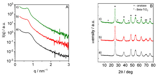 (A) SAXS and (B) XRD powder patterns of pristine and doped TiO2 materials prepared with 0.5 mol% doping metal after annealing at 450 °C; a—pristine om-TiO2, b—om-0.5 mol% Cu/TiO2, c—om-0.5 mol% Ce/TiO2 (the single SAXS pattern was shifted by multiplication with a constant factor).