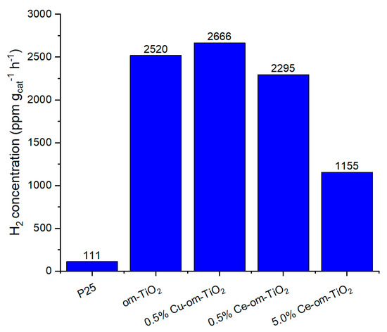 The addition of 0.5%mol of Cu in the mesoporous structure leads to a 5.8% percent increase in H2 production, from 2520 to 2666 ppm gcat−1 h−1. The addition of Ce though seems to be detrimental to H2 production as the 0.5%mol Ce/om-TiO2 sample exhibited 8.9% less H2 than the om-TiO2 sample (2295 ppm gcat−1 h−1). The higher SSA and actual metal loading of the Cu-modified sample could explain the better performance of the om-0.5% mol Cu/TiO2 when compared to the 0.5%mol Ce one. Similarly, the slightly lower surface area caused by Ce may have an influence, which is in line with our assumption that any direct influence of the dopant on the reaction is small. Another possibility is that Cu causes a slightly improved absorption of visible light (Figure 3). Cu is also more likely to be reduced to a metallic state under irradiation, which may then provide active sites for H2 formation. As is evident from Figure 5, the presence of the mesoporous structure is the main reason for the much higher H2 evolution compared to P25. While the addition of Cu leads to an increase in H2 production the extra cost associated with the preparation of the Cu-doped om-TiO2 material is not justified by that marginal increase in productivity.