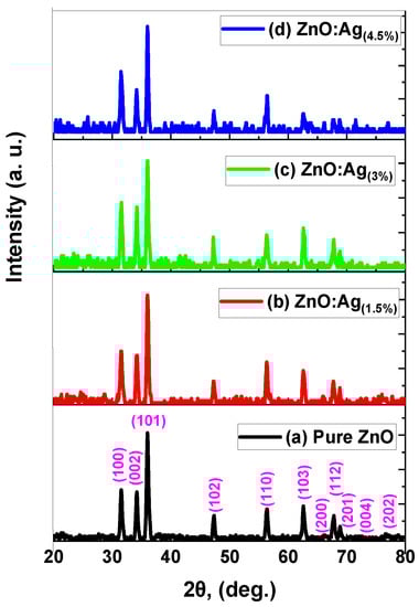 Figure 1 illustrates the X-ray diffraction (XRD) patterns for a series of samples, including pure ZnO, ZnO:Ag(1.5%), ZnO:Ag(3%), and ZnO:Ag(4.5%). The XRD pattern for the pure ZnO sample reveals distinct peaks corresponding to multiple lattice planes, thereby verifying the hexagonal wurtzite crystal structure and suggesting the presence of a single-phase crystalline material with preferential growth of nanostructures along the b-axis. Conversely, the XRD patterns for the ZnO:Ag samples exhibit well-defined yet narrower peaks, indicating good crystallinity with diminished intensity for characteristic ZnO peaks, implying a reduction in ZnO crystallinity. The absence of silver oxide peaks and the improbability of Ag+ ions substituting Zn2+ ions in the ZnO lattice—due to the significant difference in ionic radii—suggest the formation of a crystalline Ag phase and the persistence of Ag agglomerates on the ZnO surface. An analysis of the XRD patterns for specific ZnO-Ag samples demonstrates that the highest intensity peak for ZnO-Ag(1.5%), ZnO:Ag(3%), and ZnO:Ag(4.5%) is located at the (101) lattice plane, indicating a preferential growth of nanostructures along the b-axis as well.