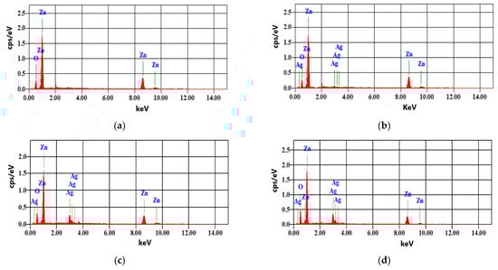 EDX spectra of samples (a) Pure ZnO, (b) ZnO:Ag(1.5%), (c) ZnO:Ag(3%), and (d) ZnO:Ag(4.5%).
