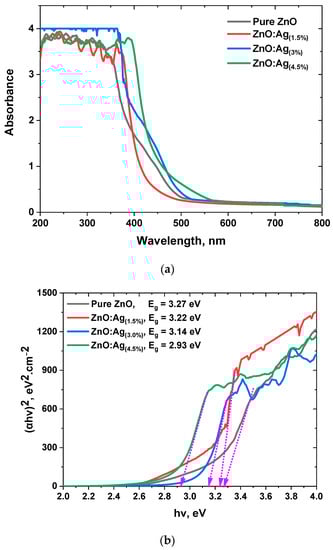 The optical band gaps of the synthesized samples, specifically pure ZnO, ZnO:Ag(1.5%), ZnO:Ag(3%), and ZnO:Ag(4.5%), were scrutinized using UV-Visible absorption spectroscopy. Figure 4a exhibits their corresponding UV-Vis absorption spectra. The absorption edge of undoped ZnO at 384 nm resulted from electron transfer events occurring from the O2p orbital to the Zn3d orbital. The maximum absorption peak’s shoulder originated from the critical electron transitions in ZnO, spanning from the valence band to the conduction band. Incorporating Al as a dopant induced a substantial redshift in the absorption edge, shifting toward higher wavelengths and leading to a reduced band gap. Figure 4b portrays the absorption edges of the samples. The optical band gaps of the nanostructured samples were ascertained using the UV-visible absorption spectra and the subsequent equations: Equations (7) and (8). Fundamental physical constants and parameters, such as Planck’s constant (), the speed of light (), the maximum absorption wavelength (), the absorption coefficient (), the absorption constant (), and a dimensionless constant () that varies with the semiconductor type are all intricately connected to Equation (7), which represents the optical band gap in the context of semiconductor materials.