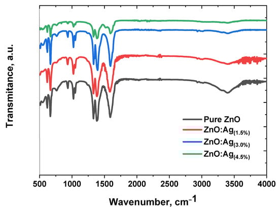 The stretching mode of metal-oxygen bonds characteristically yields peaks within the 400 to 600 cm−1 range. Prior investigations have established that peaks encompassing 437 to 455 cm−1 furnish valuable information pertaining to the ZnO stretching vibration in hexagonal ZnO crystals []. The ZnO band is discernible at approximately 530 cm−1 in both undoped and Ag-doped ZnO nanostructures, as depicted in Figure 5. The peak spanning 3300 to 3700 cm−1 can be attributed to the O-H stretching of hydroxyl groups or water molecules adsorbed onto the nanoparticle surface. The lack of silver bands in the silver-modified ZnO spectra implies an absence of chemical linkage between silver and ZnO. The peak observed at 1500 cm−1 is associated with the bending vibrations of Zn(OH)2 as well as the stretching modes of symmetric and asymmetric C=O bonds. Furthermore, some bands identified during nanoparticle formation may be ascribed to the absorption of airborne carbon dioxide and water moisture on the surface of metal cations, exhibiting a peak at approximately 2350 cm−1 [].
