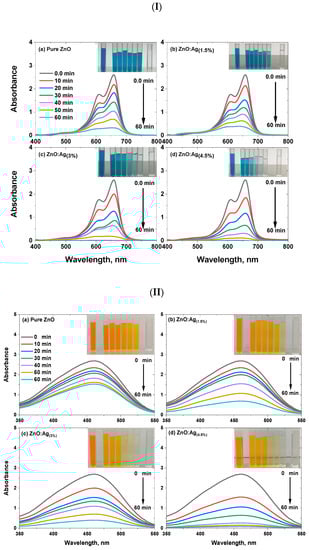 The UV-Visible absorption patterns of (I) MB and (II) MO dye examined using (a) Pure ZnO, (b) ZnO:Ag(1.5%), (c) ZnO:Ag(3%), and (d) ZnO:Ag(4.5%).