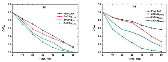 Concentration spectra of (a) MB and (b) MO using pure and Ag-doped ZnO nanostructures as a catalyst.