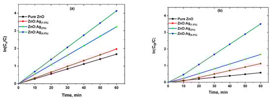 The degradation process was notably enhanced by the low band gap energy associated with the Ag-doped ZnO catalyst. This property contributed to an increase in oxygen defects and surface area, ultimately resulting in a more robust photocatalytic activity. Due to their superior performance, Ag-doped ZnO nanopowders hold significant potential for application in cost-effective and environmentally friendly pollutant remediation processes, requiring only a brief period for implementation. Figure 7 and Figure 8 delineates the results of photocatalytic kinetics, which were employed to determine the dye degradation rate, represented by a plot of as a function of time as shown in Figure 9.