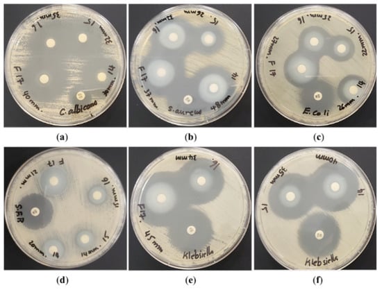 Positive control antibiotics and, from left to right, Pure ZnO, ZnO:Ag(1.5%), ZnO:Ag(3%), and ZnO:Ag(4.5%), were tested against (a) C. albicans, (b) S. aureus, (c) E. coli, (d) Bacillus subtilis, and (e,f) K. pneumonia.
