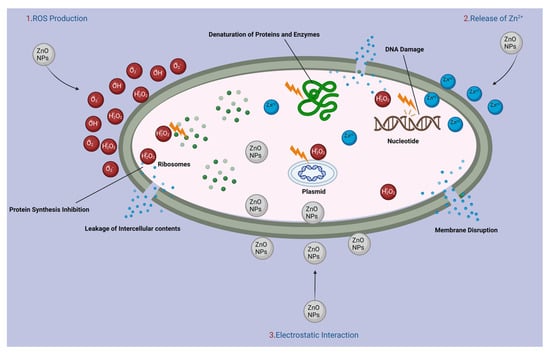 ZnO-NPs and Ag-NPs produce ROS, which instigate oxidative stress in microorganisms and disrupt crucial cellular functions []. The release of silver ions (Ag+) from Ag-NPs interacts with bacterial cell membranes, consequently augmenting membrane permeability and facilitating the leakage of intracellular contents []. This interaction not only distorts the plasma membrane structure but also interferes with metabolic functions, leading to the leakage of intracellular contents, akin to the effects observed in ZnO-NPs [,]. Additionally, Ag+ ions possess the ability to bind to bacterial proteins and enzymes, thereby inhibiting their activity and perturbing essential metabolic processes [], an outcome reminiscent of the impact of Zn2+ ions released from ZnO-NPs. Moreover, silver ions have been implicated in disrupting bacterial DNA replication, hindering cell division, and inhibiting bacterial growth [].