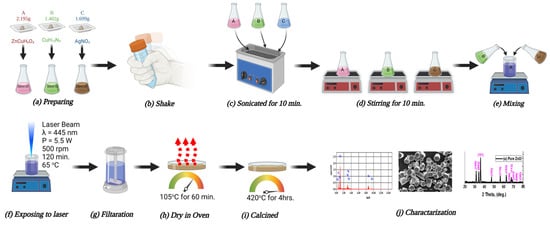 Laser-assisted systems operating in continuous wave and pulsed modes, encompassing the ultraviolet to infrared range, have exhibited significant potential for treating, designing, and fabricating functional nanomaterials []. This rapidly evolving field offers straightforward, economical, and scalable methodologies coupled with high-yield production capabilities []. Laser-Assisted Chemical Bath Synthesis (LACBS) technology, by exerting precise control over chemical reactions, thermal effects, and nucleation and particle growth phenomena during nanostructure synthesis, can generate nanostructures possessing desirable characteristics such as larger surface area nanoparticles for the production of antimicrobial agents [,].