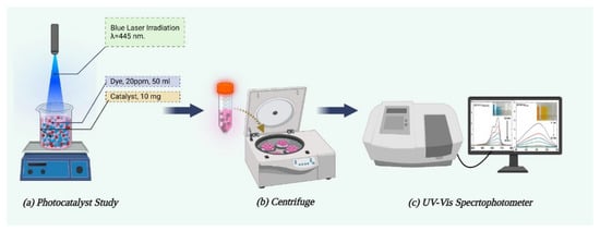 The extracted samples were then examined thoroughly using a UV/Vis spectrophotometer, which revealed maximum absorption values of 656.4 nm for MB and 461.2 nm for MO. Employing Equations (17) and (18) as previously reported in the literature [,], the degree of dye degradation, apparent degradation rate (), and photodegradation efficiency () were systematically calculated. and denote the MB concentration at the initial time and at a specific time post-irradiation, respectively. A comprehensive schematic diagram illustrating the methodological approach of the photocatalytic investigation is presented in Figure 15.
