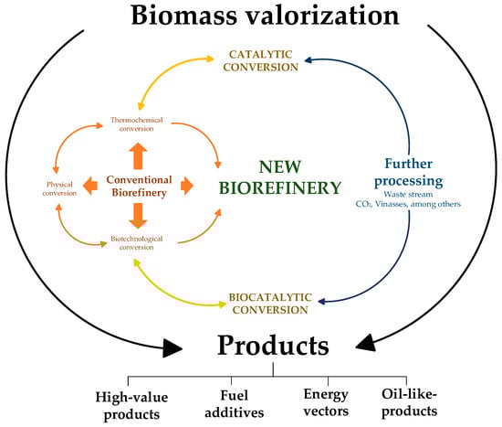 Biorefineries’ implementation has been slowed, as current technologies upgrade non-renewable resources at the industrial level. Therefore, the transition from crude-oil refineries to biorefineries remains slow compared to the research on biomass upgrading at a lab scale []. A path towards easier industrial biomass use, leaving aside traditional uses (i.e., combustion), is to upgrade biomass-derived products through catalytic processes to obtain chemicals without requiring an in-depth technological transition. Therefore, catalysis is crucial for (i) shortening distances between academia and industry regarding biomass use, (ii) enhancing biorefinery designs, (iii) creating new biomass conversion pathways, and (iv) increasing processes’ sustainability. Biorefineries comprise thermochemical, biotechnological, chemical, and physical processes through which several compounds can be produced. Thus, catalytic upgrading can be present in all these processes. Indeed, several research efforts have demonstrated the importance of applying catalysis to improve technical indicators (i.e., yields, productivity, and product purity) []. These improvements are discussed while considering thermochemical biomass upgrading and catalytic biomass fractionation as follows.