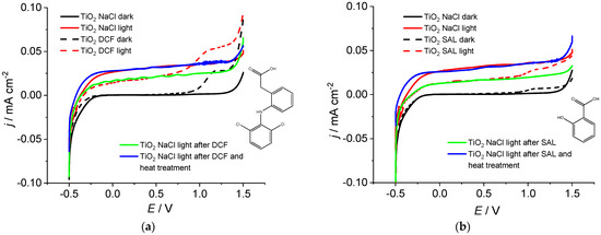 Investigations were performed in 0.1 mol dm−3 NaCl solution in the presence and absence of 0.1 mmol dm−3 of the studied pharmaceuticals (DCF, SA or MEM). Additional measurements were carrid out in the presence of MEM with a concentration of 0.5 mmol dm−3. Linear sweep voltammetry was carried out with a scan rate of 20 mV s−1 in the dark and under light illumination. All potentials are reported versus saturated calomel electrode (SCE).