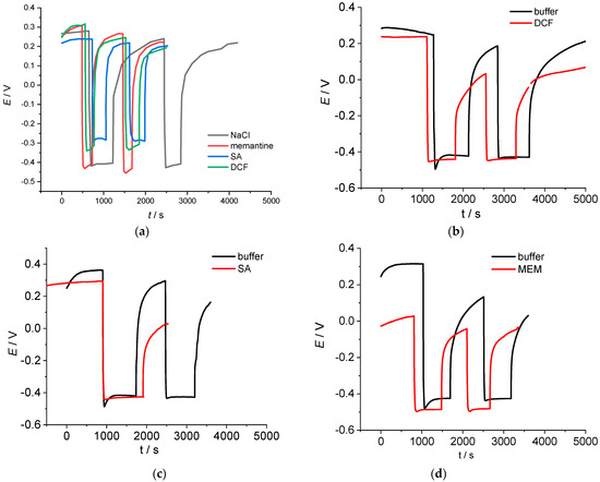 Open-circuit potential of the TiO2 electrode in chopped light irradiation in (a) NaCl solution containing MEM, SA or DCF, (b) in a buffer solution and a buffer solution containing DCF, (c) in a buffer solution and a buffer solution containing SA, (d) in a buffer solution and a buffer solution containing MEM.