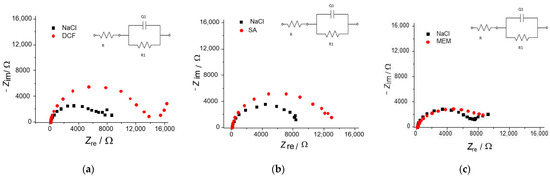 The Nyquist plot obtained for the TiO2 electrode under UV irradiation at OCP in NaCl solution or NaCl solution containing 0.1 mmol dm−3 of (a) DCF, (b) SA, and (c) MEM; insight figures present electrical equivalent circuit used to fit the EIS spectra.