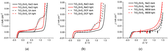 From Figure 4, it is evident that jlight >> jdark, indicating the good photoactivity of the TiO2/SnS2 composite material. The current response of the TiO2/SnS2 electrode in the NaCl solution is not constant, as in the case of TiO2. During the potential sweep, the current value increases continuously, which is a consequence of the more effective separation of the photogenerated charge carriers in the presence of an electric field. The more effective charge separation is the result of a process involving an upward bending of the conduction and valence bands and the formation of a depletion layer at the electrode/electrolyte surface, which directs the photogenerated e− to the FTO substrate and h+ to the electrode/electrolyte interface. This phenomenon is related to the influence of the positive potential on the n-type semiconductors [47,54]. A thicker depletion layer is expected for SnS2 compared to TiO2 because of the larger SnS2 particle size. The morphological properties of SnS2 and TiO2/SnS2 were reported by Kovacic at al. [55]. The presence of pharmaceuticals reduces the TiO2/SnS2 current in the NaCl solution (Figure 4) in a similar way as in the case of TiO2 (Figure 1a–c). For DCF and SA solutions, the current decrease is evident only at potentials more negative than 0.5 V, because the current peak associated with the electrochemical reaction dominates at positive potentials higher than 0.5 V (Figure 4a,b). Although SA and DCF do not absorb light in the visible range, they affect the photocurrent response by blocking the active sites for the photocatalytic reaction. In the case of MEM (Figure 4c), a significant current decrease was obtained, which is different from the behaviour of TiO2 in the MEM solution (Figure 1c). These results indicate that MEM affects the composite much more than TiO2.