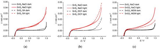 To clarify the obtained behaviour, the SnS2 electrode was also investigated in the presence of the studied pharmaceuticals. The results (Figure 5) indicate that the SnS2 electrode has a higher photocurrent compared to the TiO2/SnS2 electrode (Figure 4), which is not surprising since SnS2 has a smaller band gap compared to TiO2 and absorbs light in the visible region, while TiO2 is not active in the visible region. It should be noted that the LED illumination used in this work provides only visible light [56]. The current value in the NaCl solution for SnS2 and TiO2/SnS2 electrodes at 0.5 V was about 6 μA and 4 μA, respectively, while at 1 V it was 12 μA and 6 μA, respectively. The influence of SA and DCF on the electrochemical response of SnS2 electrode (Figure 5a,b) was not significant; however, the influence of MEM (Figure 5c) was similar to that in the case of TiO2/SnS2. It is also evident from Figure 5 that the characteristic current peak related to the redox reaction of DCF and SA did not occur for the SnS2 electrode, while it did for TiO2 and TiO2/SnS2. This can be explained by the position of the valence band of SnS2, which is above the Fermi levels of SA and DCF. The current peak was obtained for the TiO2/SnS2 composite electrode due to the position of the TiO2 valence band.