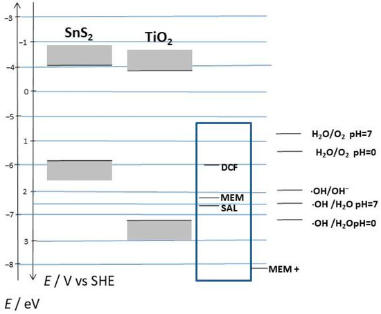 It follows that the HOMO position of SA and DCF is above the position of TiO2, leading to the oxidation of SA and DCF by the electrochemically generated h+. This is well-supported by the current peak formed during electrochemical polarisation (Figure 1a,b). The HOMO position of MEM strongly depends on its protonation. The h+-scavenging effect of MEM (Figure 1c) indicates that the unprotonated form was involved in the PEC reaction. It is obvious that the protonated form of MEM (MEM+) with the position of HOMO below that of TiO2 is important for electrochemical oxidation at high potentials. The unfavourable ratio between the TiO2 HOMO and the MEM+ HOMO prevents the electrochemical oxidation of MEM+ and the formation of current peaks (Figure 1c). For the SnS2 electrode, the situation is completely different because h+ cannot oxidise SA, DCF, or MEM, resulting in no current peak occurring when the SnS2 electrode is polarised.