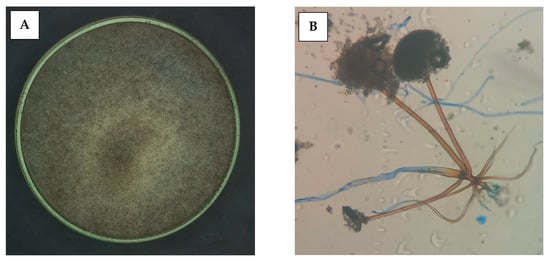 Rhizopus stolonifer grown on potato dextrose agar medium (A) and light microscope graph showing fungal sporangiophores, stolon, rhizoids, and sporangia filled with immotile sporangiospores (B).