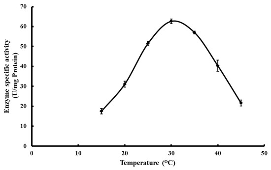 The impact of the incubation temperature of the culture on amylase production by Rhizopus stolonifer was studied at different incubation temperatures (15–45 °C). The obtained results in Figure 2 demonstrate that amylase productivity by Rhizopus stolonifer increased dramatically with an increase in the incubation temperature within the range of 15–30 °C. However, there was a drop in amylase production at temperatures above 30 °C. Therefore, the maximum enzyme production was estimated at 30 °C, recording 62.65 ± 1.16 U/mg protein.