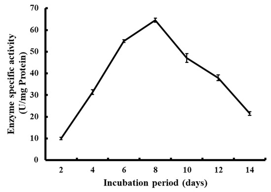 Rhizopus stolonifer was incubated for different incubation periods (2, 4, 6, 8, 10, 12, and 14 days) to investigate the effect of incubation time on the production of amylase. The data in Figure 4 show an association between amylase production by Rhizopus stolonifer with prolonging the incubation time, and the optimum period for the highest amylase production of 64.50 ± 0.96 U/mg protein was reached at 8 days of incubation and the amylase production started to decrease gradually (Figure 4).