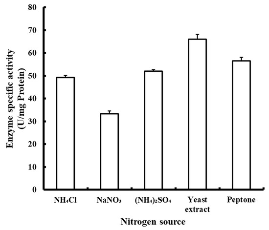 The effect of different nitrogen sources on amylase production was investigated and the obtained results indicated that the tested fungal isolate Rhizopus stolonifer can make use of all the nitrogen sources. Among the tested nitrogen sources, yeast extract was the best substrate with the highest amylase production (66.70 ± 2.04 U/mg protein), followed by peptone, ammonium sulfate, ammonium nitrate, and sodium (Figure 5). So, yeast extract is considered the best nitrogen source for the enhancement of amylase production on potato peel waste-containing medium.
