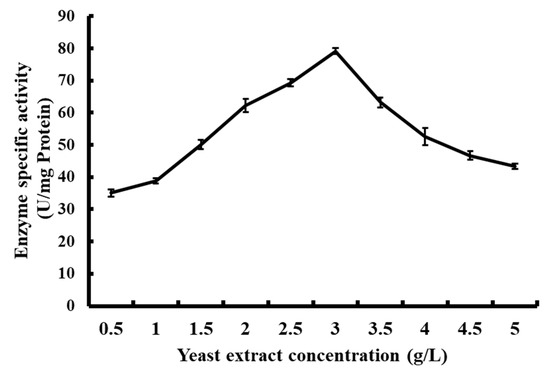 Effect of yeast extracts concentration on amylase production by Rhizopus stolonifer. The triplicate mean ± SD (vertical bars) is presented.