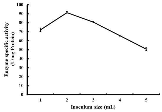 Effect of Rhizopus stolonifer inoculum size on amylase production. The triplicate mean ± SD (vertical bars) is presented.