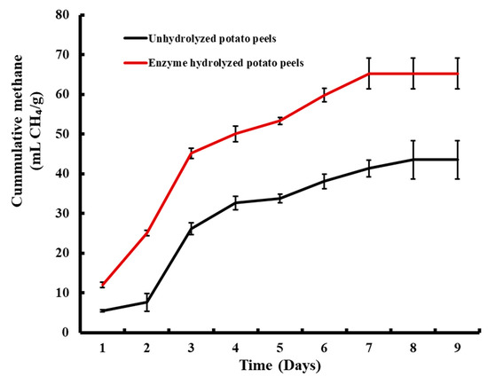 Cumulative biogas (methane) production from the hydrolyzed potato peel wastes and unhydrolyzed potato peels. The triplicate mean ± SD (vertical bars) is presented.