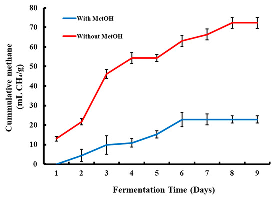 Cumulative biogas (methane) is produced from one-pot fermentation (with the addition of methanol) and sequential two-stage fermentation. The triplicate mean ± SD (vertical bars) is presented.