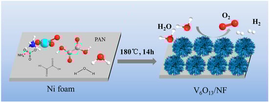 In this work, V6O13/NF was synthesized using a facile one-step hydrothermal method with 0.5 g of NH4VO3, 0.5 g of polyaniline (PAN) and 0.1 g of oxalic acid (H2C2O4) dissolved in 30 mL ultrapure water, after magnetic stirring for 30 min; then, the cleaned nickel foam was added. Next, the above solution was loaded into the 50 mL high-pressure reaction kettle and heated at 180 °C for 14 h. Once cooled down to room temperature, the composite covering on the NF surface was produced, carefully cleaned alternately with ultrapure water and ethanol several times, and then dried in a vacuum for 10 h. Then, V6O13/NF self-supporting electrodes were obtained (as shown in Figure 1).
