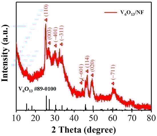 The V6O13 nanosheets self-assembled micro-flower arrays grown in situ on nickel foam (denoted as V6O13/NF) were synthesized using a simple one-pot hydrothermal reaction, as illustrated in Figure 1. For comparative studies, a control sample was obtained under identical experimental conditions with the exception that no oxalic acid was added (denoted as VOx/NF, Figure S1). As shown in Figure 2, the composition and crystal structure of the V6O13/NF materials scraped from NF were studied using X-ray diffraction (XRD). The obvious diffraction peaks were located at 25.4°, 26.8°, 30.1°, 33.5°, 45.6°, 45.8°, 49.5° and 59.8° and were attributed to (110), (003), (−401), (−311), (−601), (114), (020) and (−711) planes of the monoclinic V6O13 phase (PDF #89-0100), respectively. The results manifest that V6O13 was successfully synthesized on the surface of the NF substrate. For comparison, the VOX/NF sample was obtained when H2C2O4 was not added into the synthetic process. As shown in Figure S2A, it can be observed that some diffraction peaks located at 21.55°, 27.68° and 35.45°are indexed to (200), (202) and (311) crystal planes of the tetragonal V4O9 (PDF#23-0720) phase, and other diffraction peaks at 20.26°, 26.13° and 31.00° can be assigned to (001), (110) and (400) planes of orthorhombic V2O5 (PDF#41-1426). The results confirm that the existence of H2C2O4 played an important role in the formation of the V6O13 phase.