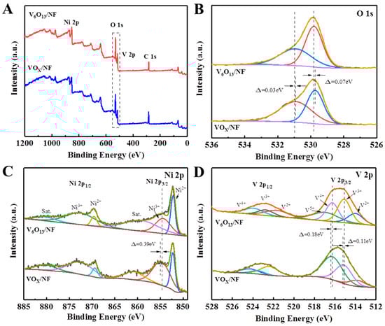 High-resolution XPS spectra: (A) survey; (B) O 1s; (C) Ni 2p; and (D) V 2p of V6O13/NF and VOX/NF.S.