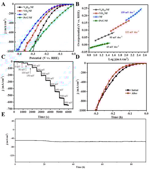 (A) HER polarization curves and (B) Tafel slopes of NF, V6O13/NF and VOX/NF; (C) multi-step chronoamperometric curves of HER over V6O13/NF in 1.0 M KOH solution; (D) polarization curves recorded for V6O13/NF before and after the 90 h I-t test; and (E) I-t curve obtained for HER of V6O13/NF in 1.0 M KOH at a constant current density of 50 mA cm−2.