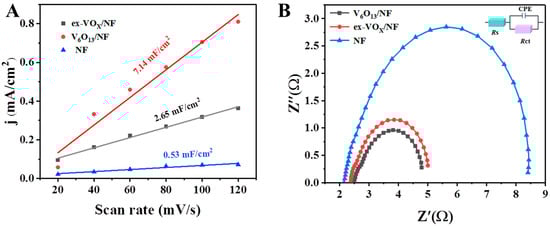 (A) Double-layer capacitance (Cdl) for the evaluation of ECSA and (B) Nyquist plots recorded at an overpotential of 50 mV of NF, V6O13/NF and VOX/NF.