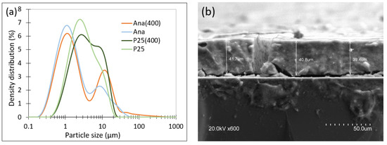 The powders of Ana, Ana(400), P25, and P25(400) were analyzed in the dry state using a laser diffractometer for their particle size distribution, as shown in Figure 3a. It can be seen that in the dry state, the particle sizes range from 0.1 to 100 μm, with both Ana and Ana(400) having the same maximum peaks at 1.2 μm; however, P25 and P25(400) had the maximum peaks at 2.6 and 2.9 μm, respectively. This indicates that the calcination at 400 °C does not shift the range of particle sizes much. For the photoelectrochemical analysis in this study, the powder was first mixed with distilled water, which usually leads to agglomeration, and thus, the magnetic stirring of the mixture is necessary to separate the powders in the paste. The microstructure and the thickness of the paste after being coated on the FTO using the doctor blade technique were examined under SEM. Figure 3b shows one example of the side morphology of the paste coated on FTO, which is P25. The average thickness of P25 is found to be 40.6 ± 1.2; P25(400), 35.9 ± 1.6; Ana, 37.1 ± 3.6; and Ana(400), 33.5 ± 4.8 μm. Figure 3c–f show the top morphology of the nano-compact P25, P25(400), Ana, and Ana(400), respectively, with the particle sizes being found to be between 51.6 and 82.4 nm for P25, 43.7 to 55.2 nm for P25(400), 41.7 to 78.4 nm for Ana, and 32.3 to 70.4 nm for Ana(400). All the particle sizes are bigger than 10 nm, wherever the discrete energy (quantum effect) can be neglected [30].