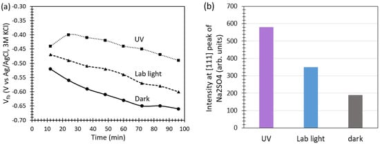 Different irradiation sources, which are UV, lab light, or dark, were adopted and scanned from the potential of 1 to −1 V, with each scan lasting 12 min, using a frequency of 400 Hz. The same scan was repeated eight times on the Ana(400)-ss&ss thin film to study the effect of immersion duration. It can be seen that different irradiation sources pose different values on the Vfb of Ana(400)-ss&ss. An obvious deep shift of Vfb to a negative value is observed with time under the UV, laboratory light, or dark, as shown in Figure 8a. At the eighth scan, the differences in the Vfb of UV, laboratory light, and dark are bigger than the differences in Vfb at the first scan. When the sample is examined under XRD, it reveals that the intensity at peak [111] of thenardite is higher when the irradiation source is UV, followed by laboratory light and the dark, as shown in Figure 8b. Figure 8c–e are SEM microstructures, SEM mappings, and an EDX spectrum showing the thenardite Na2SO4 salt on the surface of Ana(400)-ss&ss under the UV, respectively. The samples under the laboratory light or in the dark have similar characteristics to those under UV. Thus, the shift of Vfb to a negative value could be, again, due to the deposition of a layer of thenardite Na2SO4 salt, instead of the influence of the application of different types of irradiation sources.