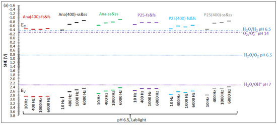 In Figure 12a, samples are tested at pH 6.5 under laboratory light and divided into two groups, which include ss&ss (under the condition of the same sample and same solution throughout the test) and fs&fs (under the condition of fresh sample and the fresh solution being applied for each frequency tested). It can be seen that Ana(400)-ss&ss, Ana-ss&ss, and P25(400)-ss&ss tend to show an obvious upward shift in their band-edge positions from 10 to 6000 Hz, while Ana(400)-fs&fs, P25-fs&fs, and P25(400)-fs&fs tend to show a slight upward shift. Despite that, they do not lose their photocatalytic ability in hydrogen and oxygen production via water splitting at pH 6.5 because their EC is well above the corresponding pH-indicated potential, and the EV is well below the corresponding pH-indicated potential [16,51,52].