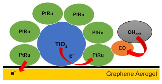 The proposed mechanism of PtRu/TiO2-GA for the enhanced catalytic MOR activity as shown in Figure 2 can be defined as follows: (1) The unusual electronic reaction of the metal support between PtRu and TiO2 results in electron transfer from the support to the metal, resulting in an increase in electron density at PtRu downwards, corresponding to the PtRu d-band centre. In general, the centre of the d-band is driven by the ability of surface d-electrons to participate in adsorption bonding. Based on the downward displacement of the d-band centre, reducing the metal back bond to CO can reduce the bonding energy between CO and PtRu atoms [47,48,49]. (2) In the catalyst, OHads, or oxygen-containing species, can be adsorbed. TiO2 has the unique ability to convert CO-poisoning species (COads) on PtRu bifunctional to CO2, releasing the active sites of PtRu bifunctional by promoting electrooxidation activity towards methanol and CO [50]. (3) Pt, Ru, graphene aerogel, and TiO2 have a good synergy effect, resulting in a four-junction structure that effectively improves electrocatalytic performance [20].