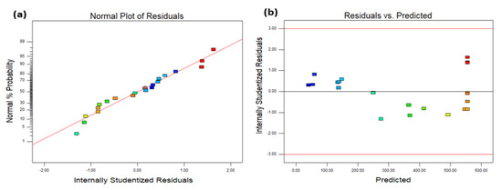 The diagnostic portion of RSM analysis is another process. In this section, graphs will be used to properly assess the model fit and transformation preference. Figure 4 depicts the model fit error, which is commonly referred to as a residual plot. Figure 4a shows a straight line for the residual normal probability plot, suggesting that the residual follows the normal distribution and contains acceptable normal error components. Figure 4b depicts a residual versus projected value plot of the model response, with a straight line at ‘0’, implying that the expected variance for such a model is constant. Simultaneously, the recommended quadratic model for the current density model appears to be appropriate, and all plots fall between the upper and lower red lines with no discernible pattern.