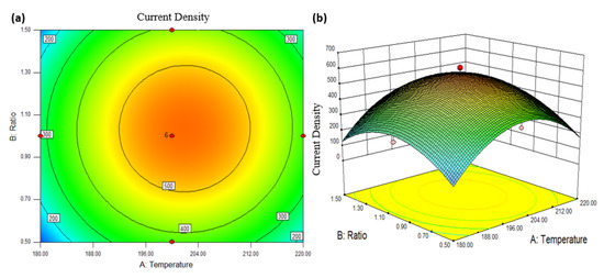 Response surface between factors; Pt:Ru ratio and a composite temperature, with the response; current density, (a) 2D contour, and (b) 3D surface plot.