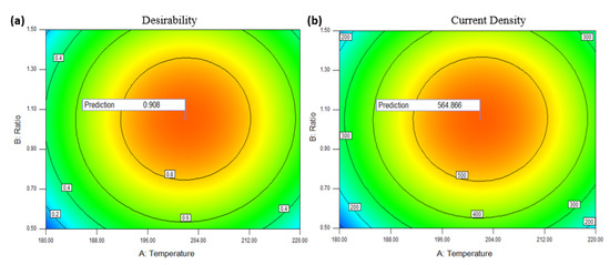 2D contour plots for, (a) Desirability and (b) Current density in terms of AB factors.