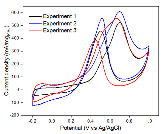 Figure 8 depicts the current density graph from the validation test. The CV test typically provides electrochemical measurements and is used to calculate the response value of this model. Once compared to the RSM anticipated value, the average validation test result was 568.15 mA/mg PtRu, which correlated to a peak potential of 0.65 V vs. Ag/AgCl with just a 0.6% error. The small inaccuracy shows that with the optimal temperature composite, Pt/Ru ratio, and catalyst composition, the best current density response may be achieved. This situation also guarantees that the RSM analysis model is effective and applicable.