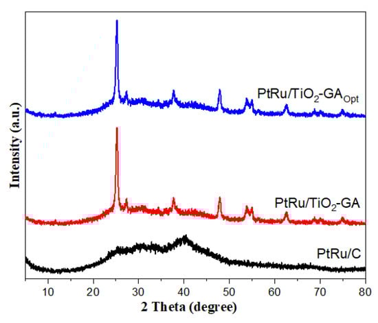 Diffraction peaks at planes (1 1 1), (2 0 0), and (2 2 0) at about 2θ are 40.7°, 47.3°, and 67.0°, respectively, which detected the Pt nanoparticle, which is compatible with the face-centred cubic (fcc) structure of Pt [55]. while the diffraction peaks for Ru are in the same plane, namely (1 1 1), (2 0 0), (2 0 0), and (2 2 0). Due to the strong crystallinity of Pt-Ru nanoparticles in the electrocatalyst system, low diffraction peaks of TiO2-GA are difficult to identify following the dispersion of Pt-Ru particles on the TiO2-GA support. The creation of a bimetal or Pt alloy in each synthesised electrocatalyst sample is also indicated by the yield of a single diffraction peak shared by PtRu in each of these electrocatalyst diffractograms [56,57].