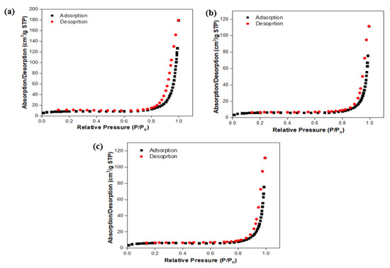 The N2 adsorption/desorption plots (Figure 10) show that PtRu/TiO2-GAOpt has a significantly larger surface area than PtRu/TiO2-GA and PtRu/C, as shown in Table 4. The PtRu/TiO2-GAOpt electrocatalyst had the lowest BET surface area of 50.59 m2/g, followed by the PtRu/TiO2-GA and PtRu/C electrocatalysts in that order. The findings of this study are comparable to those of those who found that the PtRu/C electrocatalyst had a significantly greater surface area than the metal oxide composite electrocatalyst. According to the BET adsorption/desorption isothermal curves in Figure 10, all produced electrocatalyst materials had type IV isothermal curves (based on IUPAC classification) with a little indentation of the observed width indicating H3 hysteria [59,60].