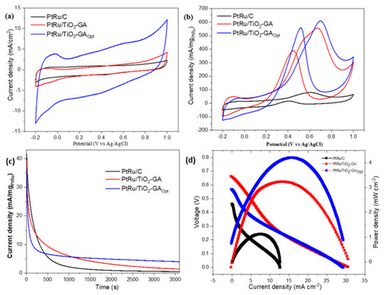As shown in Figure 11b, the electrocatalytic performance of the synthesised electrocatalyst was evaluated using CV. At room temperature, the CV curves for the electrocatalysts PtRu/TiO2-GA, PtRu/TiO2-GAOpt, and PtRu/C are measured in 2 M methanol with 0.5 M H2SO4 and saturated N2 gas. The various curves are measured between −0.2 and 1.0 V vs. Ag/AgCl. The peak current density was PtRu/TiO2-GAOpt > PtRu/TiO2-GA > PtRu/C in decreasing order. In comparison to Ag/AgCl, the peak current density of PtRu/TiO2-GAOpt for the MOR appeared to be 0.639 V. Table 6 shows the peak current density and other CV values for all of the samples. PtRu/TiO2-GAOpt has a current density of 608.17 mA mg−1, which is 1.1 and 7.6 times greater than that of PtRu/TiO2-GA and commercial electrocatalyst PtRu/C, respectively. This is due to TiO2-GA’s unusual 3D structures, which allow for a quick ion/charge transfer channel [66]. This one-of-a-kind characteristic benefits surface chemical processes and increases the activity of the electrocatalyst. Furthermore, the TiO2-GA structure enables Pt and Ru nanoparticles to attach more firmly to the TiO2-GA surface, as illustrated in the surface morphology section in Supplementary Figures S2 and S3.
