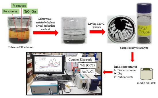 The Pt precursor, H2PtCl6, with 20% content, was kindly supplied by Merck, Darmstadt, Germany, while the Ru precursor, RuCl3 (45–55% content), supplied by Sigma-Aldrich Co., St. Louis, MO, USA, was used in the synthesis catalyst. Ethylene glycol (EG), Nafion solution, isopropyl alcohol, ethanol, and methanol were obtained from Sigma-Aldrich. Titanium isopropoxide (TiPP, 97%) was obtained from Sigma-Aldrich Co. Graphene oxide was obtained from GO Advanced Solution Sdn. Bhd (Malaysia).