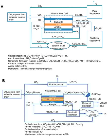 CO2 feedback can come from point sources, such as a power plant with a CO2 capture unit, or air, by using direct air capture (DAC) technology. For an alkaline-flow-cell electrolyzer (Figure 1A), it consists of three flow channels: one is for CO2 flow, while the other two are for catholyte and anolyte flow. CO2 is fed into the cathode compartment of the electrolyzer and flows through the GDLs to reach the catalyst/catholyte interface for the CO2-reduction reaction. The gaseous-reduction products and unreacted CO2 stream outflow the cathode chamber, and the unreacted CO2 is separated by a pressure swing adsorption (PSA) unit and recycled into the cathode compartment. The methanol generated from CO2 reduction dissolves in the catholyte and is separated from the electrolyte by a distillation process [8].