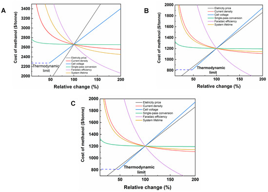 As shown in Figure 2A, for the alkaline flow cell, the cost of methanol gradually decreased with the increase in Faradaic efficiency, system lifetime, current density, and single-pass conversion, while it increased with the increase in cell voltage and electricity price. Among them, the most sensitive parameters are electricity price and Faradaic efficiency, followed by system lifetime and cell voltage. As shown in the Supplementary Materials, the increase in electricity price raises the costs of electricity, PSA operation, carbonate regeneration operation, and other operations, such as repairing and labor. The increase in Faradaic efficiency decreases the capital costs of the electrolyzer, catalyst, membrane, electrolyte, and the costs of electricity and other operations, as well as the costs of PSA separation operation, BoP, and installation.