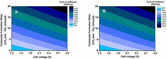 Cell voltage is another important factor affecting methanol cost. The alkaline flow cell has the advantages of low cell voltage and high energy efficiency [20], but its electrocatalytic chemical production cost is limited by carbonate formation. The MEA electrolyzer can largely avoid carbonate formation, but its cell voltage is usually high [23]. In order to clarify the sensitivity of methanol cost to cell voltage and crossover/carbonate formation, we analyzed the impact of changes in cell voltage and crossover/carbonate formation on methanol cost, respectively. As shown in Figure 3, reducing crossover/carbonate formation is more effective than reducing cell voltage at reducing methanol cost for both the alkaline flow cell and the MEA electrolyzer. Therefore, although it would increase cell voltage, optimizing the electrode/electrolyzer design by using a bipolar membrane would reduce carbonate formation [24] and therefore reduce methanol cost. However, this phenomenon is not particularly significant for the MEA electrolyzer (Figure 3B). This is because, after reducing carbonate formation, the cost of catholyte regeneration and CO2 recovery in the alkaline-flow-cell system is significantly reduced. While reducing crossover in the MEA electrolyzer reduces the cost of anode CO2/O2 separation, this part of the cost accounts for a relatively low proportion. Therefore, in order to achieve low-cost methanol production, it is very important to reduce crossover/carbonate formation and cell voltage at the same time.