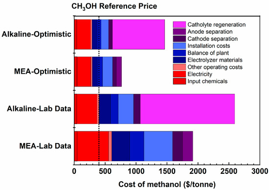 Next, we compare the cost of electrocatalytic CO2 methanol production by the alkaline flow cell and MEA electrolyzer systems. Costs are based on reported and optimized data, with the assumption that the electricity price is 0.02 USD/kWh. For the MEA electrolyzer, we consider the cost of recovering CO2 due to crossover. For the alkaline flow cell, we calculated the cost of regenerating and recovering CO2 from the catholyte. So far, most of the research on CO2 electrocatalytic reduction into methanol has been carried out in H-type reactors [25,26,27], with only a few studies using an MEA electrolyzer or alkaline flow cell [28]. Peter et al. reported [29] that in an alkaline flow cell, when the catholyte was 1 mol/L KOH solution, the CuGa intermetallics achieved 76% Faraday efficiency of methanol production at −0.3 V vs. RHE potential. Kong et al. [28] reported 70% Faraday efficiency of methanol production in a 5 cm2 MEA electrolyzer at a full cell voltage of 3.4 eV. To model the impact of crossover/carbonate formation on cost, we set the MEA electrolyzer crossover ratio and alkaline-flow-cell carbonate formation at 4 and 24, respectively, and the single-pass conversion rate was set at 30%, according to data reported in the literature [22]. These data indicators constitute the laboratory data input in this work. In order to predict future methanol costs, we determined the cost input under the optimized situation by combining data from a water electrolyzer and a CO2 electrolyzer with optimized situation data reported by many previous studies [17,30,31,32,33,34,35].